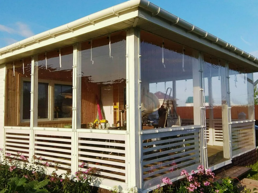 Конструкция с плавным переходом от прямой стены к двускатной крыше, без свеса кровли. Используется для складов, производства, спортивных сооружений. Постройка выдерживает высокие нагрузки, подходит для занятий активными видами спорта: футбол, хоккей, большой теннис, баскетбол, т.д.